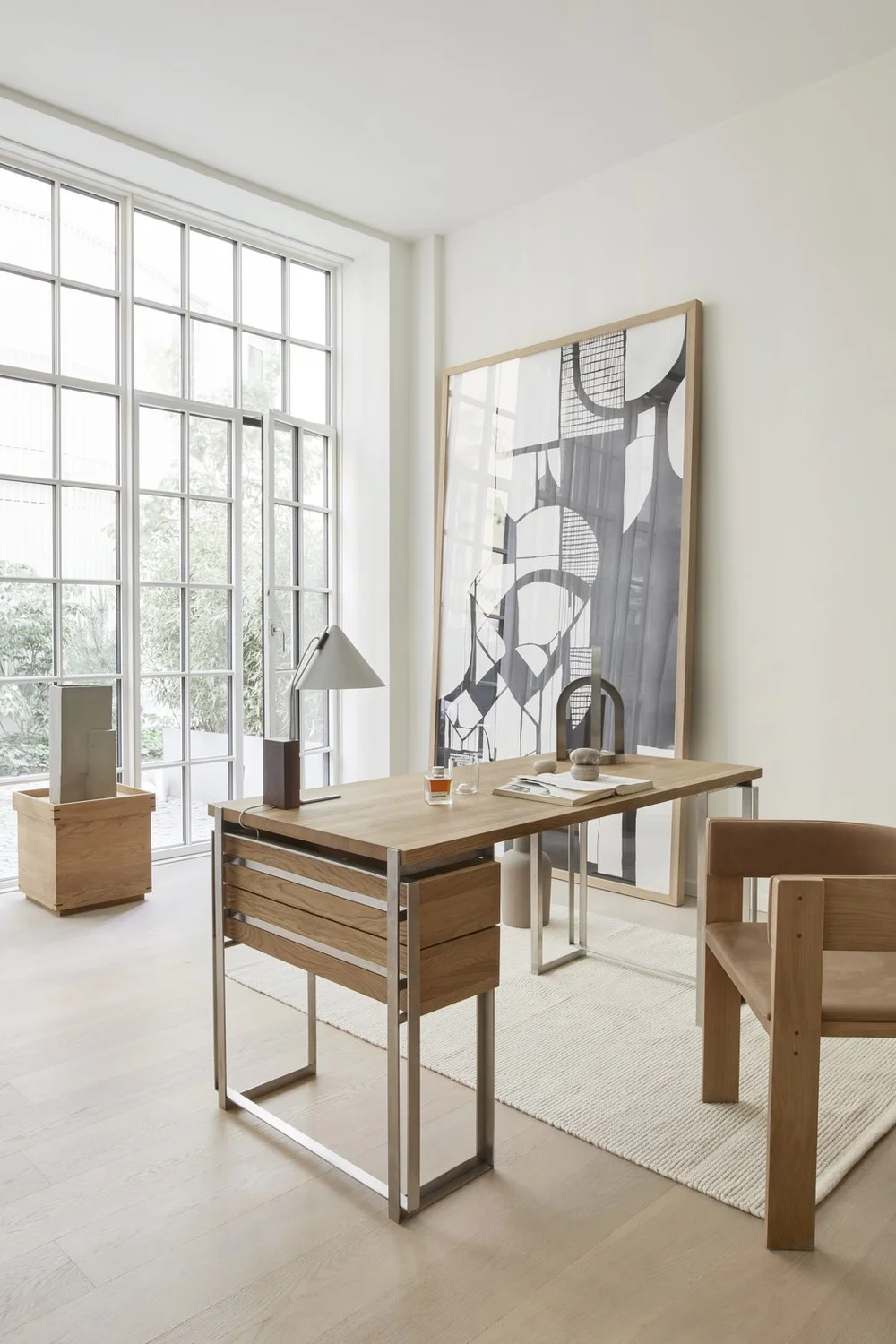 The stunning apartment, tucked away in the backyard of an old architectural factory in Copenhagen center and provided the perfect setting for Dam’s one-of-a-kind paintings and sculptures, along with showcasing the new Outline Desk with its sleek lines, steel frames and solid oak desktop and drawers. The desk elegantly combines classic Danish design with a more forward-looking contemporary vibe. Would you like to see some photos of this inspiring piece, along with the space overall?